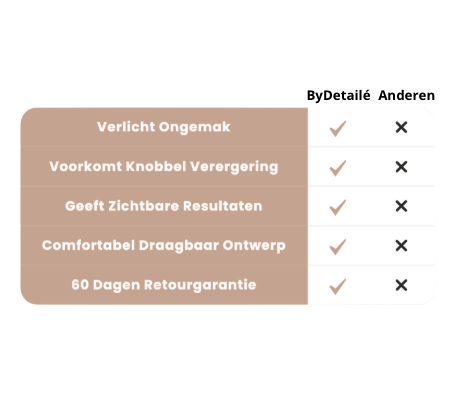 Je kunt verwachten dat de pijn vermindert in 7 dagen, je teen zichtbaar rechter staat in 30 dagen, en na verloop van tijd genoeg spierkracht opbouwt om de knobbelvoet tegen te gaan.