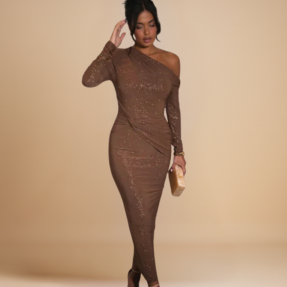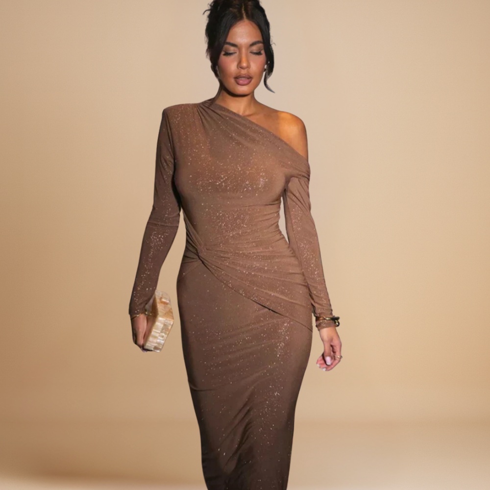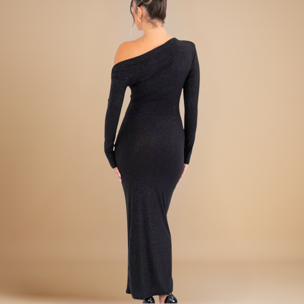 Deze jurk voelt aan als een tweede huid: licht, soepel en zacht, waardoor hij prachtig om je lichaam heen beweegt. De off-shoulder halslijn creëert een elegante, vrouwelijke uitstraling die net dat beetje sensualiteit toevoegt zonder overdreven te zijn. De subtiele sparkles vangen het licht op een chique manier en geven je die luxueuze, avondwaardige glans. Dankzij de flatterende plooien en het elegante, slanke model oogt je figuur langer, slanker en harmonieuzer.